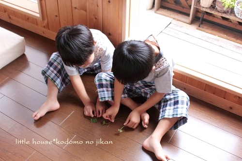 little house*■双子とお兄ちゃんの暮らし■ のんびりゆっくり気ままなフォト日記・・・*PAGE | 237 236 235 234 233 232 231 230 229 228 227 | ADMIN | WRITE 2009.06.17 Wed 00:30:01 ■ 四葉のクローバー・・・*■・・・・・・・・・・・・・・・・・・・・・* さて・・・ これは何でしょう? かいわれ大根じゃないですよ~(汗)" お家で育てている四つ葉のクローバーを ゆうとそらが摘んで来てくれたのでした。 クローバーがずいぶん伸びきっていたので 丁度良かったです。( ̄▽ ̄)" クローバー摘みを楽しむお二人さん…♪ ●何だか嬉しそうなゆうちゃん● 最近、ベランダでよく遊ぶお二人さんです。 ●そらちゃん● いっぱいクローバー摘めたかな? ●そらちゃん● ●ゆうちゃん● そして・・・ 摘んできたクローバーを並べます。 ●真剣な二人・・・● そしてまた・・・ 夢中になってクローバーを積んでました。 でもそのうちに・・・ ●こんな時もあります● 母:『ゆうちゃん、意地悪は駄目だよ!!』 ゆう:『ハイ!ハイ!』 ●調子のいいゆうちゃん● アッ・・・(ふと・・・思い付いたのでした。) そうだ。 せっかくだからクローバーのリースでも作りましょ* そして喜ぶゆうちゃん。 ●わ~い♪● ゆうちゃんもママのマネしてみます。 ・・・でもやっぱり無理そう。 リース作り、ゆうちゃんにはまだ難しかったかな? そしてお二人さんは・・・ まだまだクローバーを摘んでいました。 ずっと・・・ 四葉のクローバーを 二人で集めていたのですが・・・ いつの間にか・・・ ゆうちゃんが独り占めしてしまった様子。 ●いじけるそらちゃん● ぁ~ぁ~・・・ ちょっと可哀想なそらちゃん・・・ ●そらちゃん、怒ってます● 母:『ね~ね~。 ゆうちゃん、そらちゃんにも葉っぱさんあげようね。』 ゆう:『うん。分かった』 ・・・意外と素直なゆうちゃんでした。 (ヤレヤレ・・・)( ̄Д ̄)" そしてまた・・・ クローバーを夢中になって摘んでいました。 お二人さんがたくさん摘んでくれたので・・・ ドンドン大きくなってきました。 ●クローバー● 母:『そらちゃん!見てみて~♪』 ●驚く!そらちゃん● 長くなっていくクローバーを見て嬉しかったのか? また夢中になってクローバーを摘んでくれました。 そのうちベランダで・・・ こんなやり取りもあったりして・・・ 何だか微笑ましく二人の様子を見てしまいました。 そらちゃんの優しさに・・・ ちょっぴりジーーーーンとしてしまいます。 そしていつの間にか完成してしまった・・・ 四葉のクローバーのリース。 ●完成!● せっかくなので・・・ 記念撮影しました。 まずはそらちゃんを・・・パチリンコ☆ 続いてゆうちゃんも・・・パチリンコ☆ ん~♪ 可愛いです* せっかく作ったリースなので しばらくの間・・・ ここに飾ってみました。 小さくて可愛い* これは・・・みんなの優しさが い~~~~っぱい詰まったリースだね* ・・・・・・・・・・・・・・・・・・・・・・・・・・・* 日記がおもしろかったら・・ポチッと押して頂けると嬉しいです* ぜひ!応援!!宜しくお願いします* ↓ ポチッ ●ランキング3ポチっ・・・とよろしくお願いします● ◆お問合せ&お便りメールはこちらからどうぞ◆ ![]() PR CommentsComment Form |