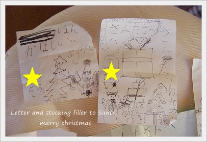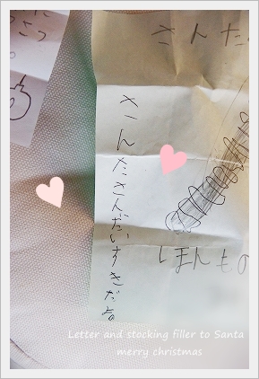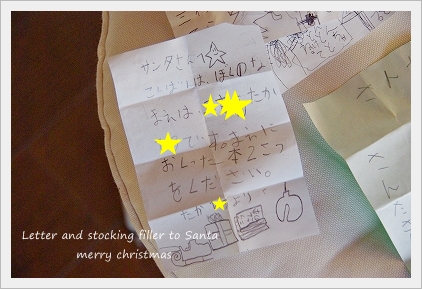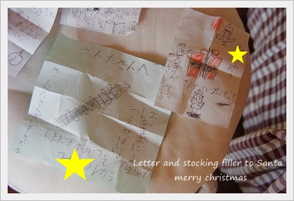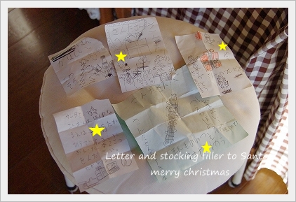 子供たちもサンタさんへお手紙を書いて・・・ いつも、靴下の中に自分で書いたサンタさんへのお手紙を ●ほらね!● …子供たちが書いたお手紙…。 子供たち。 サンタさんからのお返事のお手紙… (毎年作っております)(汗)” ↓ ↓ ↓ このお手紙をクリスマスイブの夜に靴下の中へ入れておくんです。 (サンタさんになったつもりで・・・)笑 クリスマスの朝・・ どんな顔をするか楽しみ…♪ この手紙の中に… だから、クリスマスの日の朝は…