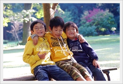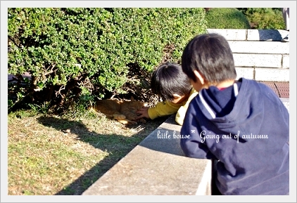 little house*■双子とお兄ちゃんの暮らし■ のんびりゆっくり気ままなフォト日記・・・*PAGE | 24 25 26 27 28 29 30 31 32 33 34 | ADMIN | WRITE 2010.12.17 Fri 22:09:52 ■ キラキラの森の中で…* ■ k-mお家から40分くらいの所にある公園まで 家族揃って遊びに出掛けました。 ●マイカメラを持って出掛けるお兄ちゃん● ●キラキラしてました● まだ少し紅葉していたので、葉っぱがとても綺麗でした。 せっかく紅葉が綺麗だから、みんなで記念撮影しました。 …最近、まとものスリーショットが撮れないんですが… …っつうか、撮らせてくれないのです(T_T) ●急な石の階段を上って…● (母さんは、体力が持ちましぇん) めっきり、子供たちについて行けなくなってきました。(T_T)はい! ●あれ?なんだ~??● …母さんも座りたいです。(‘О‘)” ちょっと疲れるけど… ここには、公園もあるので、 ポカポカの日差しで日向ぼっこしている ●あっ・・・ネコちゃんだ● …母さんは、羨ましいのです。( ̄О ̄)お~ ●ネコちゃんが気になるそらちゃん● …そして、1番動物好きな…ゆうちゃん。 ●寒いから、あったかいココアお飲むそらちゃん● みんなそれぞれに楽しく過ごせたみたいです。 袋いっぱいにお土産にして持ち帰ったドングリ… 『もう~、いっぱいあるからいいよ!』って言っても・・・ ●ありがとう~♪ ゆうちゃん●