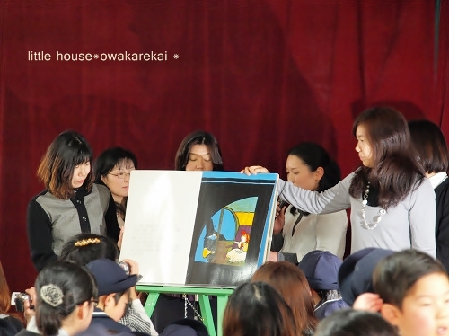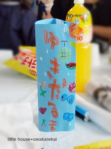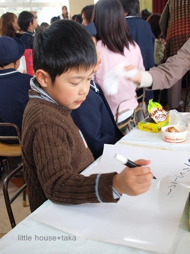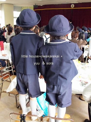 little house*■双子とお兄ちゃんの暮らし■ のんびりゆっくり気ままなフォト日記・・・*PAGE | 158 159 160 161 162 163 164 165 166 167 168 | ADMIN | WRITE 2010.03.13 Sat 22:55:47 ■ お別れ会…* その1 ■・・・・・・・・・・・・・・・・・・・・・* 先日、卒園する年長さんと保護者とで 幼稚園最後の『お別れ会』がありました。 ●沢山のテーブル…● ゆうとそらのテーブルは… 『ゆきだるま』という名前でした。 ↑↑これは、みんなで描いて作ったんだそうです。(かわいい~) テーブルの上には… ランチとおやつもありました。 そして… なぜか? ちょっと緊張気味のゆうちゃん。 そして、対照的に なんだかとっても嬉しそうなそらちゃん… ゆうちゃん… どうして緊張しているの? ●お歌が上手に歌えるか心配…●(なんだそうです) ゆうちゃんは、お歌が上手だから大丈夫!大丈夫! お兄ちゃんもパパの代役出来てくれました… ●ゆうちゃん、お兄ちゃんいるから大丈夫!● …っと頼もしい応援していました。(にこっ)(^-^) 自分たちで作った自分の姿にお手紙が添えてありました。 ●ゆうちゃんの…● ●そらちゃんの…● …ん。良く見れば…なんとなく似てるかな?(笑) そして… ゆうとそらは、泣かせてくれるお手紙を読んでくれました。 ●お兄ちゃんはビデオを撮っていました● もう~ ウルウルな私。(T_T)”” 今からこんなにウルウルしていて… 卒園式の日はどうなることやら…(号泣しそうです) でも… そらちゃんのこの顔を見たら… 笑っちゃいますね。 ●お手紙読んでるよー● お手紙を読んでくれたあとは… お食事をしながらみんなで楽しく過ごします。 ●さっそく食べ始めるゆうちゃん● …うまい! そして、最初は・・・ 先生たちからのクイズ大会がありました。 ビニールに顔を押し付けて(変顔を楽しむのですが…)プププ…っ 先生が何を言ったかを当てるゲームでした。 先生たちは、お嫁に行けないかも… なんて言ってましたが…(笑) ●『●☆▼◆※・・・・』● なかなかの度胸です。(おみごと!) 先生の変顔に驚くそらちゃん。 ●ひょえ~っ!● …でも、そらちゃんのお顔の方がすごいですぞ。(ハイッ!) ●そっ…そう?● しかし… 先生が何て言っているのか ちっとも聞き取れなかった私ですが… 子どもたちは、分かるんですよね~(すごい) お兄ちゃんもすらすら~っと書き始めてました。 ●ん? バンクーバー?!● …そうとも聞こえなくはなかったような…??? (ちっとも私は分かりませんでした。)(V_V*)”ショボーン・・・ そして、お兄ちゃんが書いてくれた紙を 自信たっぷりに見せているゆうちゃん。 ・・・そしてバンクーバーが正解となりました。(さすがです) クイズの後は… 役員さんの読み聞かせがありました。 ●大きな絵本を読んでくれました● そして、保護者の方の生演奏まであってビックリでした。 何だか・・・ すごーく本格的でした。 ゆうとそらは… 椅子の上に立って… 真剣に見入ってました。 ・・・まだまだ、つづく。 *………………………* 日記がおもしろかったら・・ポチッと押して頂けると嬉しいです* ■ありがとうございます■ ↓ ポチッ *・・・・・・・・・・・・・・・・・・・・・・・・* PR |