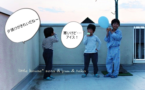 little house*■双子とお兄ちゃんの暮らし■ のんびりゆっくり気ままなフォト日記・・・*PAGE | 350 351 352 353 354 355 356 357 358 359 360 | ADMIN | WRITE 2009.05.02 Sat 23:01:54 ■ 嬉しい贈り物と気球・・・* ■・・・・・・・・・・・・・・・・・・・・・* いよいよGWですね! 我が家のパパさんはカレンダー通りなので 明日からお休みです(ホッ) 今年のGW・・・遠出も予定していたんですが・・・ 世間ではインフルエンザが流行っていたり、 ETCで車を使う人がより増えて、高速道路も混雑しているし 遠出をしても疲れるだけかな~っと思って・・・ 今年も近場コースで楽しく過ごそうという事になりました♪ 明日は、子供たちの希望でボーリングに行く予定なんです。 そんな子供たちから・・・ 手作りの優しい贈り物を頂きました。 ジャ~ン!! 折り紙で作った可愛いお花ちゃんです。 男の子3人兄弟の我が家の子供たち・・・ 意外と優しいし、器用だし、センスもいい? (ホント・・・親ばかですみません)(汗)" でも、本当に本当に優しい子供たちなんです。 しかも・・・ 男の子なのにこんな可愛いお花ちゃんを作ってくれるなんて 母は、嬉しすぎます(≧▽≦)"ありがとう! この日の夕方・・・ お兄ちゃんが何やら作っていました。 お兄ちゃんは、作る事がすきなんですよね~ 本日作ったもの・・・ 風船? ・・・って、ただの風船じゃないですよー3 気球なんです。 ↓ この日の夕方・・・ お兄ちゃんは、この気球を空に飛ばしたいというので 屋上へ上がって行きました。 双子達も空に飛んだ気球を見たいとお兄ちゃんと一緒に屋上へ・・・ 日も暮れ始めて・・・ 三日月さんも『こんばんは』・・・してました。 お風呂上りの3兄弟。 風が少し冷たくなっていました。 西の空はまだ夕焼けがきれいでした。 寒いのに・・・ アイスを食べる双子のゆうとそら。 ↓ そして・・・ いよいよ!!! お兄ちゃんの作った気球を飛ばしちゃいます! 本当は、1・2・3で飛ばしたかったのに・・・ ↑この写真を撮った後すぐに強風が吹いて ピュ~~~~~~~~っと気球が飛ばされちゃったんです。(T_T)” 慌てて・・・ 飛んでいってしまった気球の写真を撮りました。 慌てすぎて・・・ピンボケ(Y_Y) (ごめんよーお兄ちゃん。) でも、いい感じで上に下にと気持ちよさそうに飛んでくれました。 本物の気球が飛んでいるみたいで すごく可愛らしかったです♪ お兄ちゃんも満足そう~♪ 気球が上手く飛べてよかったね! さすが・・・お兄ちゃん。 今度は何を作ってくれるのかな~? ・・・。 それから、子供たちは・・・ あの気球は、どこまで飛んで行ったんだろう? ・・・ってずっと話していました。 (可愛いなぁ~) 子供たちと一緒に遊んでいると色んな発見があるから 楽しいですね* ・・・・・・・・・・・・・・・・・・・・・・・・・・・* 日記がおもしろかったら・・ポチッと押して頂けると嬉しいです* ぜひ!応援!!宜しくお願いします* ↓ ポチッ ●ランキング5ポチっ・・・とよろしくお願いします● ◆お問合せ&お便りメールはこちらからどうぞ◆ ![]() PR |