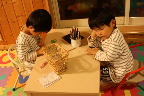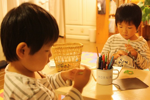 little house*■双子とお兄ちゃんの暮らし■ のんびりゆっくり気ままなフォト日記・・・*PAGE | 470 471 472 473 474 475 476 477 478 479 480 | ADMIN | WRITE 2008.10.02 Thu 23:02:31 夢中なのです・・・*memo* (写真をクリックするとより綺麗な写真が見れます) ・・・・・・・・・・・・・・・・・・・・・* 双子ちゃんランキング~ ポチッと押して頂けると嬉しいです** 応援!!宜しくお願いします* ↓ ポチッ ![]() ・・・・・・・・・・・・・・・・・・・・・・・・・・* 性格も好きなことも嫌いなことも 全然違う我が家の双子。 でも夢中になる時は、いつも一緒なのです。 今宵も・・・ (あの~っそろそろお布団敷きたいんですけど・・・)('Θ') いつまでも、いつまでも・・・ 夢中なお二人さん。 何をそんなに夢中なのかって・・・? まずは・・・ゆうちゃん。 ↓(すごい真剣) 実は・・・彼のお誕生日プレゼント アクアビーズでした。 (ゆうちゃん、いつも女の子チック大好きでして・・・)(V_V*)”” アクアビーズにもそろそろ慣れてきたので かなり夢中なのです。 色んな形を自分で考える! これはいいことだと思います。 しかも、ゆうちゃんは意外と発想が豊か?!のようです。 車とかではなくて・・・ あ~っお花ちゃん。 しかも2個目・・・(汗)” 彼のこんなに真剣な姿を見た事がありません。(ハイ!) その傍らで・・・ そらちゃんは何に夢中かと言うと・・・ お絵かきをしようと折り紙と色鉛筆を出してきたら 鉛筆の芯が短かったようでして・・・ 1本削ったらツボに入ったらしく・・・ カップの中の色鉛筆をひたすらと削りまくっていました! しかも・・・無言で。(笑) (ゴリゴリと削っております) ↓ 珍しくカメラに目も向けず・・・ ひたすらゴリゴリ・・・ しまいには・・・ そらちゃん、疲れたんだって…(お疲れ様・・・) でもゆうちゃんは、まだまだイケてます。 そして・・・ ようやくゆうちゃんもお花ちゃんが完成したので お布団敷く前にお掃除、お掃除・・・ そらちゃんがお掃除すると言うので・・・ お手伝いしてもらいました!(エライ!) かなりいい調子♪ ・・・もちろん!仕上げはママがしました~♪ ふぅ~っ・・・ ようやくお布団が敷ける・・・(お疲れ・・・私。) そして、翌朝・・・ あの、お花ちゃんが乾いて完成していました! ジャ~ン! ↓ ・・・ッぁ、私の母(おばあちゃん)とも よくアクアビーズやってます。 ・・・っつうか、やらされてます。(お疲れ!お母さん・・・) ・・・・・・・・・・・・・・・・・・・・・* お待たせしました! この度は・・・ カウプレのプレゼント企画に沢山のご応募ありがとうございました! 84名の応募もあり、暖かいコメントも沢山頂き 本当に嬉しい気持ちでいっぱいです。 皆さんのお陰でlittle houseこれからも頑張って更新していきますね* そして・・・ こども達にくじを引いてもらった結果・・・ 当選者が1名決まりました~♪ 当選者はこの方です☆ ジャ~~~~~~~~~~ン! *きゅーこsanでした* おめでとうございます! 後ほどメール送るので待っててくださいね* 外れてしまった方・・・ 本当にごめんなさい。 外れてしまった83名の方には 仲良くしていただいたお礼に little houseから年賀状を送ろうと思います。 (・・・えっ?いらない?) ま~そう言わず、受け取って貰えると嬉しいです♪ ・・・・・・・・・・・・・・・・・・・・・* 日記がおもしろかったら・・ポチッと押して頂けると嬉しいです* 応援!!宜しくお願いします* ↓ ポチッ ![]() ・・・・・・・・・・・・・・・・・・・・・・・・* ◆お問合せ&お便りメールはこちらからどうぞ◆ ![]() ◆掲示板(コメント)右下のcommentから入れます。↓ PR |