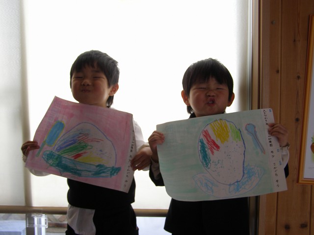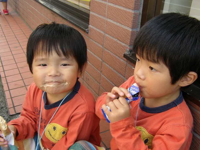 梅雨の中休みとは言え、こんなに暑くていいのでしょうか? すでに私、暑すぎて溶けちゃいそうです・・・(T_T")タラ~ 暑い日はやっぱりこれ! アイスクリームに限ります。 子供達とお散歩の途中、アイスクリームでちょっと涼しくなりました。 ・・・でも~っでもでもでもでも(そんなの関係ね~♪) 子供達ってアイス食べた後、毎回こうなんです。 今のところは、ちゅ~ちゅ~いっていますが・・・ 必ずこうなります。 まぁ~!! お兄ちゃんまで・・・ チョビヒゲさんでした・・・!(笑) そして最後に双ごっちのカキ氷? 見事に大胆に書き上げてくれました! じゃ~~~~~ん!!! ・・・なんでこの顔なんだ?(すごいです) PR |