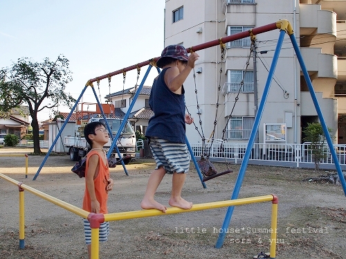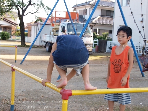 little house*■双子とお兄ちゃんの暮らし■ のんびりゆっくり気ままなフォト日記・・・*PAGE | 69 70 71 72 73 74 75 76 77 78 79 | ADMIN | WRITE 2010.08.24 Tue 15:35:56 ■ 二人きりの夏祭り…* ■(コメントのお返事は、今夜させて頂きますね!) どうも!どうも~~~~~! 毎日暑いですねー(汗)” 夏休み・・・ お兄ちゃんがいない時(キャンプでいなかったんですが…) 町内の夏祭りがありました。 今年は、ゆうとそら… 二人きりの夏祭りです。 ●そろそろ山車がくるかな~??● きたー! そろそろお祭りが始まる時間… 二人は待ちきれなくて・・・ ちょっと早いけど… お祭り会場へ・・・ ●いってきま~す●(そら&ゆう) ●あっ…誰もいないよー● …ちょっと早かったみたいなので・・・ 公園でしばし遊ぶことにしました。 ●ハッかけゆうちゃん● 最近のブーム… ポールの上を平均台みたいに歩くこと・・・ ●よっこいしょ…●(そら) ●バランスー バランスー ● お祭りがいよいよ始まって・・・ 最初はメダカすくいをしました。 ●んーーーーーなかなか手ごわい・・・●(そら) ●ゆうちゃんも・・・● メダカさん… 20匹すくいました。(汗)” (こんなにすくって…どうする??) ●すくった後のことはさておいて・・・楽しかったお二人さん● お祭りで・・・ チョコバナナを食べて・・・ ●べっとり・・●(ゆう) ●かき氷も食べて・・・●(ゆう) ●あっ…そらちゃんも● いっぱい食べたり飲んだりしているうちに 夕方になりました。 ●提灯の明りも付いたよ…● ●きれいだね~●(そら) 子供たちが楽しめるイベントが沢山あって・・・ 大人も子供も楽しい時間を過ごすことが出来ました。 ●学校の仲良しのお友達もいるよ…● ●ジャンケン大会…● ジャンケン大会では、 一回目で負けてしまったお二人さん…(T_T)残念 日が暮れて・・・ 提灯の明かりが綺麗… ●お友達のパパに写真を撮ってもらいました● ●これは、そらちゃんが撮ってくれました● 夕暮れと提灯:・・・ そして、あっという間に夜になりました。 くじ引き大会で・・・ 何と!ビール券が当たりました。(うれしい~) ビール券は、パパへお土産になったね。 今日は、お兄ちゃんもパパもいない夏祭りだったけれど・・・ 夏祭り… いい思い出が出来て良かったね! (camera = e-520) *………………………* ■ 最後まで読んでくれて、ありがとう ■ ポチッ ↑ ↑ ↑ 日記がおもしろかったらポチッと押して頂けると嬉しいです* ■ ■ コメントはこちらへどうぞ ■ ■↓ ↓ ↓ PR |